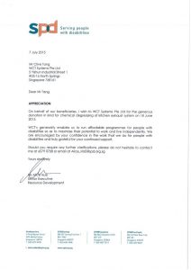 SPD – Serving People with Disabilities was happy to receive a clean kitchen exhaust system from one of our company, WCT (S) Systems. As a part of our “Giving-back” initiative, we’ve given them free cleaning & degreasing, so they may continue to serve healthy & nutritious food for the community! (Below is their Letter of Appreciation)